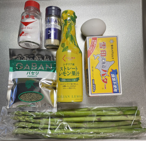 材料はこの通り。左上から塩、ホワイトペッパー、乾燥パセリ、レモン果汁、卵、無塩バター、アスパラガス。