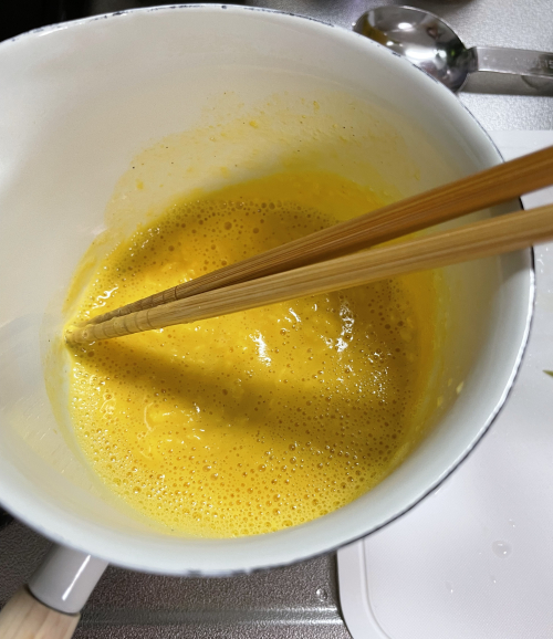 卵がちょっと固まって炒り卵みたいになっているがよしとしよう